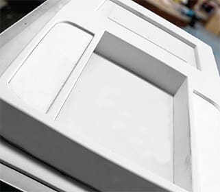Thermoforming or vacuum forming is the process of heating a sheet of plastic and using a vacuum to stretch it over a precision-cut master mould. Excess material is trimmed with a CNC cutter.